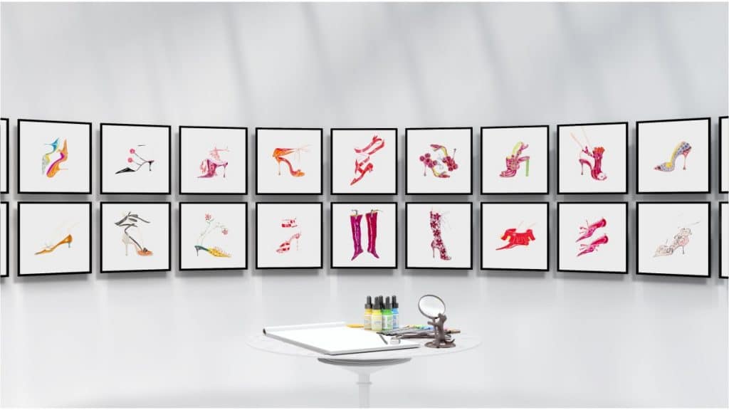 Bocetos, fotografías de archivo y vídeos… La casa recorre cinco décadas de fantasía, cristales, colores alegres y tacones vertiginosos. En otras palabras, el fabricante de zapatos español ofrece una inmersión completa a través de cinco espacios temáticos en el corazón del proceso de fabricación de los tacones de aguja que han hecho su reputación internacional en la actualidad.