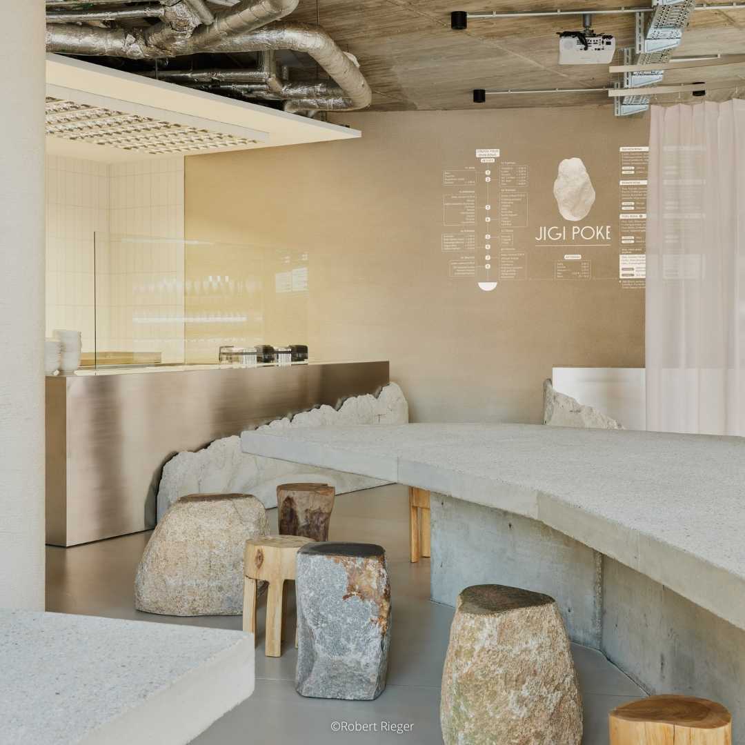 Quando ti fermi davanti al negozio di Jigi Poke, è difficile capire che si tratti di un ristorante Poke Bowls, poiché l’atmosfera intima e monocromatica può essere sorprendente. Antitesi dei motivi floreali e colorati tipici della decorazione dei ristoranti hawaiani, questo locale trendy di Berlino ha optato per un interno brutalista e scultoreo. Come la fotografia originale del pescatore di inizio secolo che adorna il muro di cemento, lo studio di architettura Vaust Studio ha riprodotto sgabelli in granito e ceppi di legno come sedili. Tonalità naturali e terrose che danno ai colori accesi dei piatti tutto il tempo di esplodere in tutta la loro brillantezza!