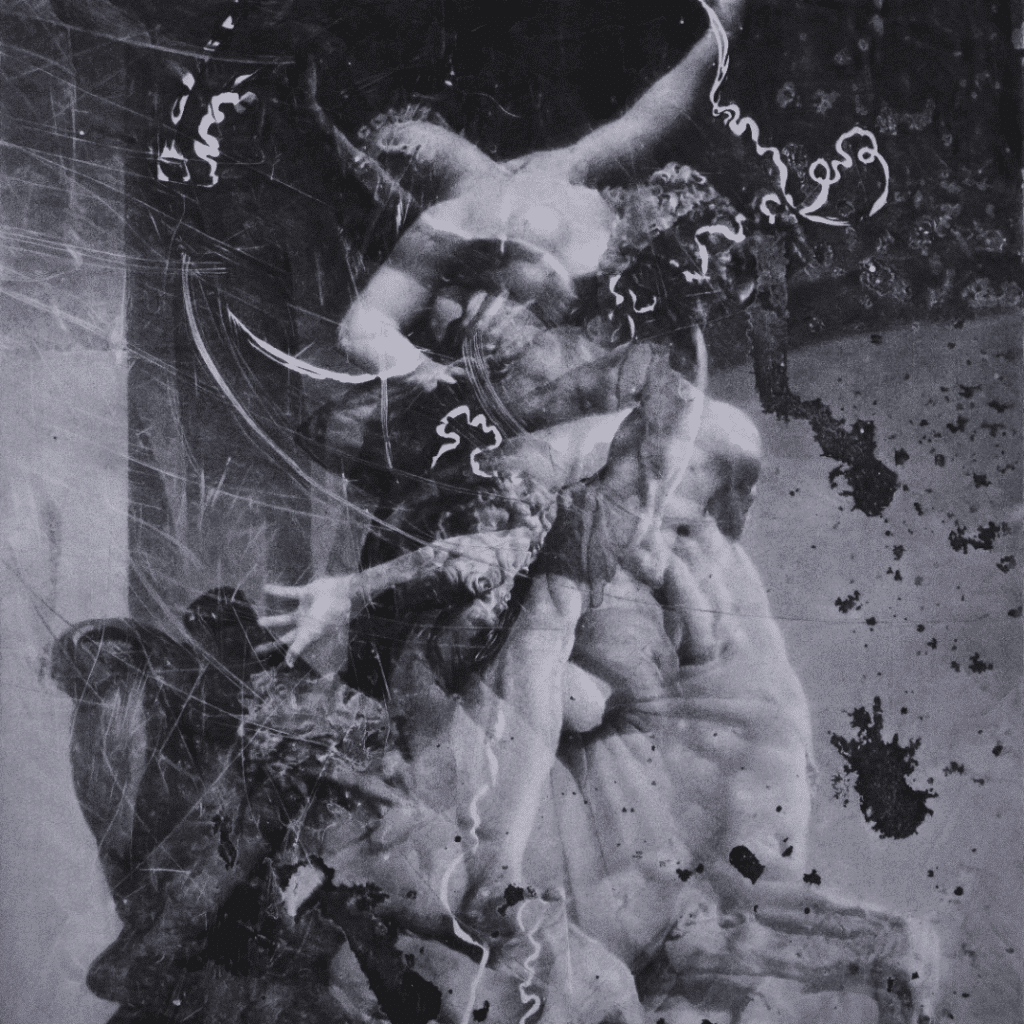 Explosion, inondation, effondrement… Des images fantomatiques capturées au Musée Sursock lors de l’explosion du 4 août 2020 ayant détruit en une fraction de seconde un tiers de Beyrouth (installation vidéo de Joana Hadjithomas & Khalil Joreige) au labyrinthe hypnotique et électro-magnétique d’Evita Vasiljevanous menant à la contemplation d’un mur éventré…, en passant par les bouquets de fibres amiantées semées sous le toit défoncé de l’ancien chalet-restaurant abandonné du parc de la Tête d’Or investi par Nina Beier…, la ruine est l’un des leitmotivs les plus récurrents de cette Biennale. Aux éboulements de charbon ensevelissant les visages de photographies anciennes et autres déversements hors cadre de papiers froissés, brûlés de Lucia Tallova répondent les photographies maculées de Munem Wasif.Aux Ruines flottantes de Clemens Behr sondant les utopies fragiles de l’architecture brutaliste – construites pour l’éternité sur la promesse d’« un monde meilleur » –, font écho les ruines architecturales tissées, composées à partir de collages numériques, de Ailbhe Ní Bhriain.C’est aussi, entre autres moyens d’expression, la tapisserie qu’utiliseMarkus Schinwald pour son Panorama du chaos : un fantastique champ de ruines déployé comme une fresque murale, le décor d’un funèbre théâtre de la mémoire, agrémenté de peintures biffées, d’un buste antique mutilé et de moulages de gueules cassées…