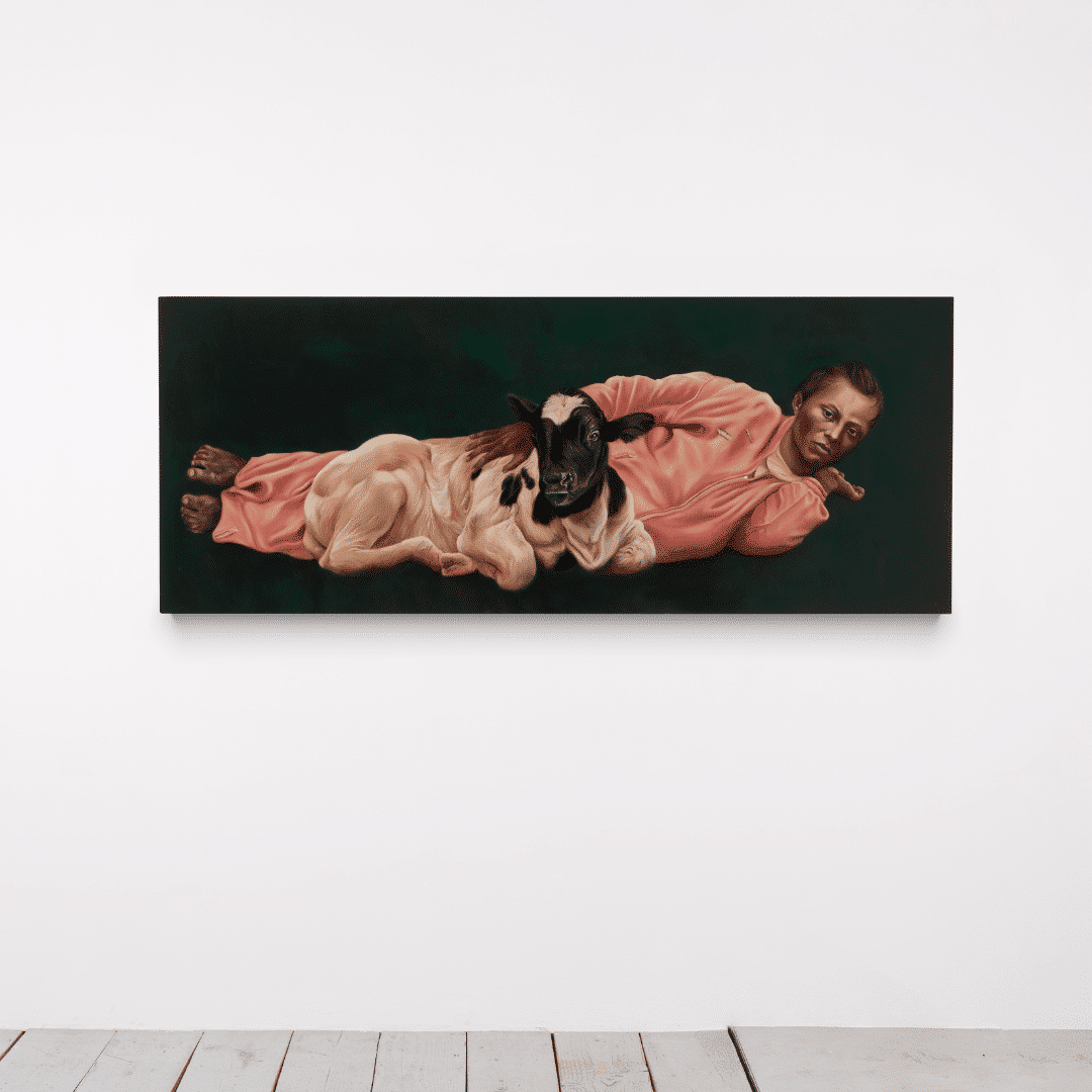 Nata nel 1965 a Bruges, diplomata all’Accademia di Belle Arti di Gent (K.A.S.K.), Sophie Kuijken dipinge ritratti strani e affascinanti nella solitudine del suo studio a Lovanio. Ritratti la cui stranezza sembra volutamente accentuata dalla classicità della fattura (di un realismo quasi leccato) e dalle pose adottate dalle modelle: ritratti generalmente frontali a mezzo busto (a volte a figura intera, a volte distesi), riprendendo i “dispositivi” accademici, fino agli sfondi scuri che proiettano la figura sulla parte anteriore della tela – sfondi in movimento terribilmente visibili e pregnanti che fanno aleggiare l’ombra del nulla… (davanti a uno schermo?) con un vitello, lì, un neonato con gli occhi sporgenti che galleggia in un “sacco a pelo” dorato lungo come uno strascico, lì, una coppia sdraiata testa-piedi, qui, un uomo che sfila in pelliccia… Dipinto alla maniera dei primitivi fiamminghi attraverso un successivo accumulo di sottili strati di vernice acrilica, olio e smalti, i personaggi che ci guardano, impassibili, hanno un qualcosa di atemporale e, allo stesso tempo, di molto contemporaneo; immersi in un misterioso chiaroscuro che cesella i loro strani volti, ci sembrano tuttavia familiari. E per una buona ragione: sono il risultato dell’accumulo di identità plurali, volti raccolti su internet poi sovrapposti per creare volti artificiali, privi di identità. Vertiginosi fantasmi …
