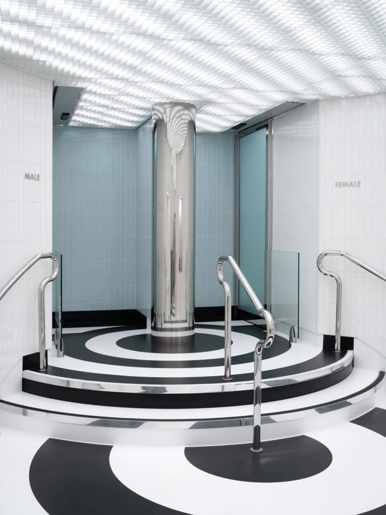 Dès l’entrée, le studio joue avec les matériaux : le hall présente de grandes fenêtres en bronze, les portes tambours sont en acier inoxydable chromé, le sol en marbre est orné d’un motif carrelé de pierre blanche et noire. Au cœur, un lobby cafe convivial, agrémenté d’une œuvre d’art murale de Wolfgang Tillmans. L’étage inférieur est à l’avenant. Le sol en époxy au motif noir et blanc mène à un local à vélos pour lequel une gamme informelle d’objets a été conçue par Christ & Gantenbein. Ce lobby de la UK House répond ainsi au besoin constant d’une architecture d’entreprise, communicative et accessible, entre hier et aujourd’hui.