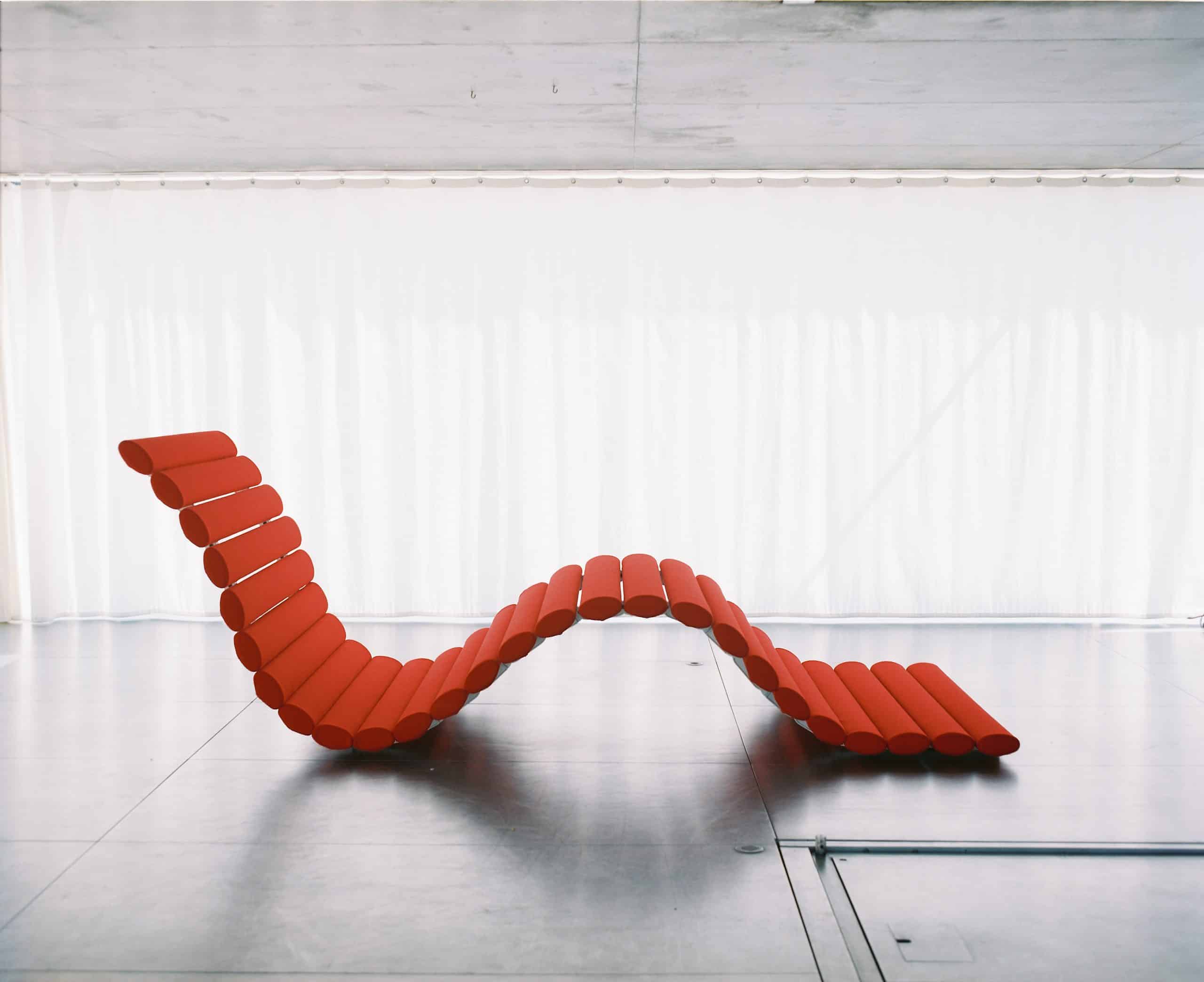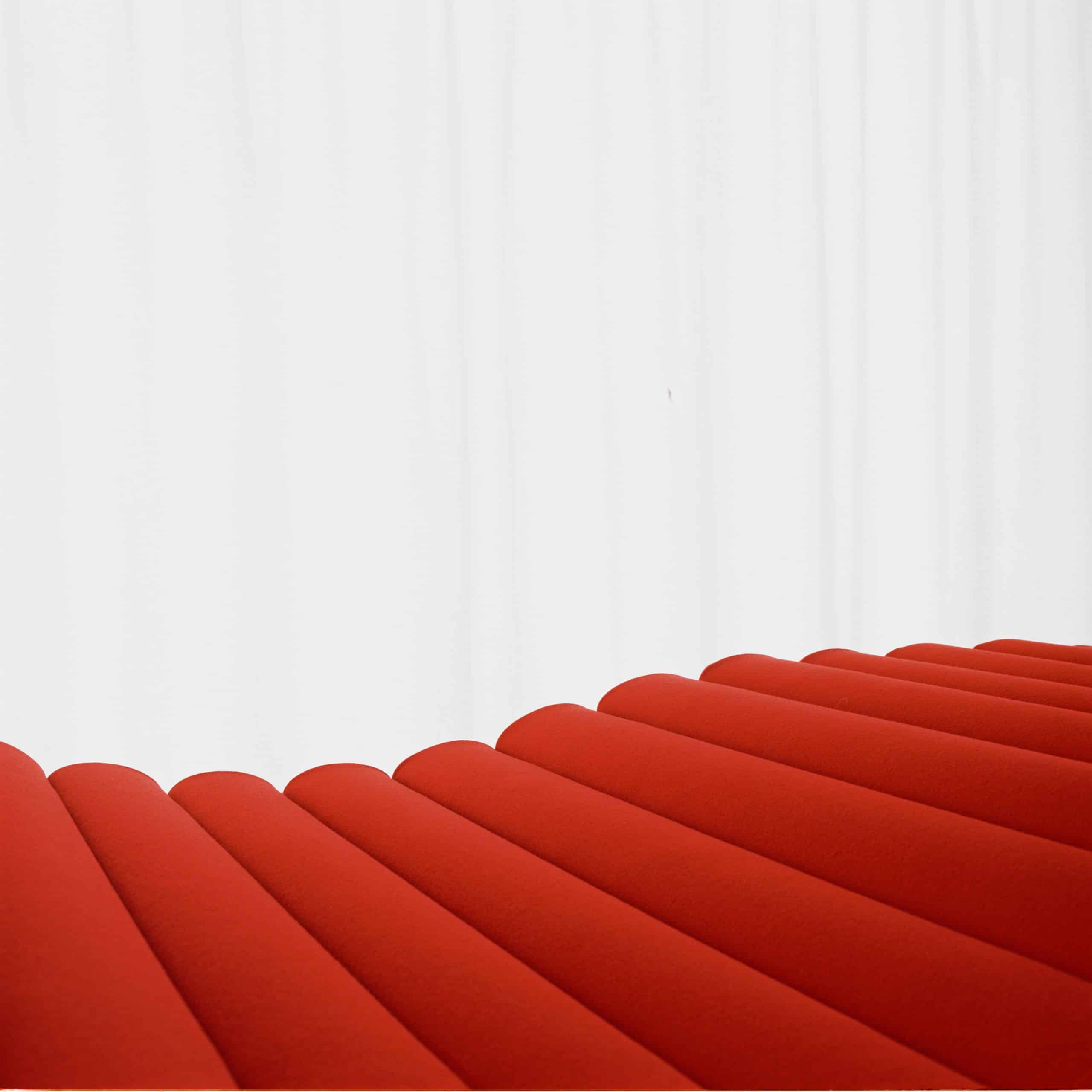 Le linee ondulate del padiglione Niemeyer rispondono alle “forme libere e sensuali” immaginate da Paulin per decompartimentare lo spazio. Oltre ai sistemi di scaffalature modulari, dal Carpet Seat (1968) ai moduli organici del Dune Ensemble (1970), i pezzi testimoniano la visione dello spazio eminentemente moderna e non statica di Paulin: come un gigantesco origami, il pavimento si piega e si articola per farci sedere…