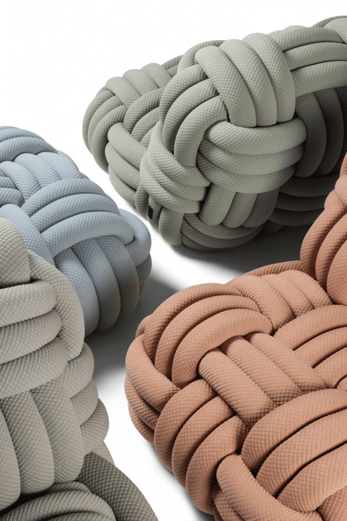 The Knitty Lounge Chair is a combination of spaciousness and softness, inspired by the mooring knots that secure ships. She thought of it as “an icon of relaxation”, created with extra-large “threads” that resemble those ship’s ropes. The thread is covered with a knitted fabric, which she uses in a pretty palette of colours. The pattern adds texture and marks a tactile return to design.