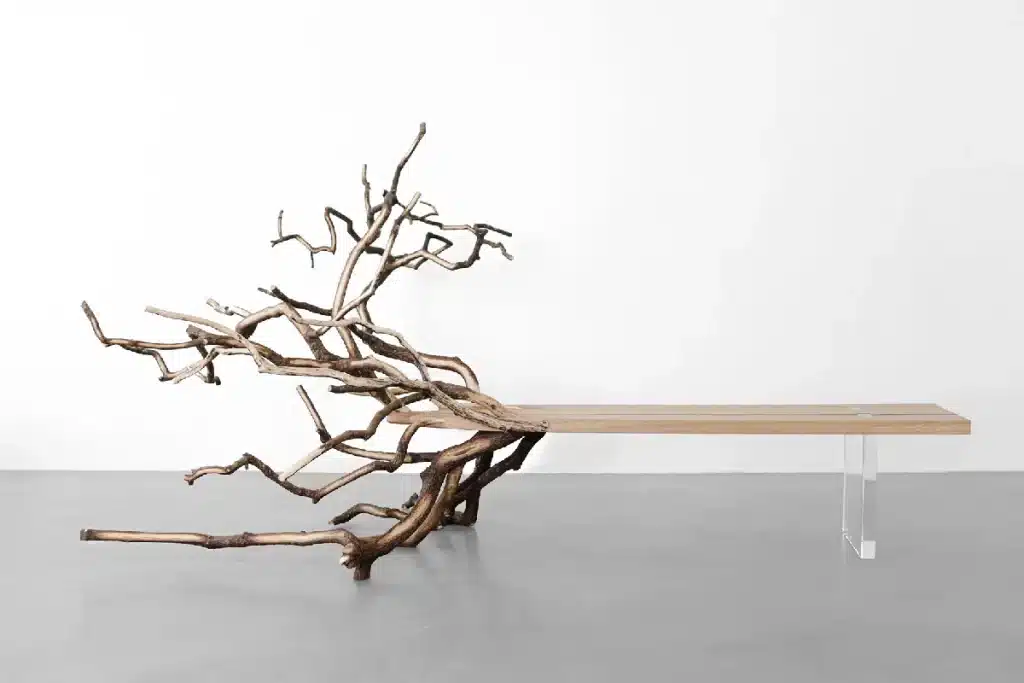 Pour Paris Design Week, elle présente une sélection de pièces où la nature inspire les formes et les matières. Un banc-oiseau se transforme en silhouette graphique, un autre rappelle la ramure d’un chêne par ses branchages sculptés, tandis que des luminaires se posent comme des galets apaisants. Parmi les signatures, le duo Normal Studio dévoile Illusions, un ensemble en bois et en acier qui joue sur les contrastes entre densité et transparence.