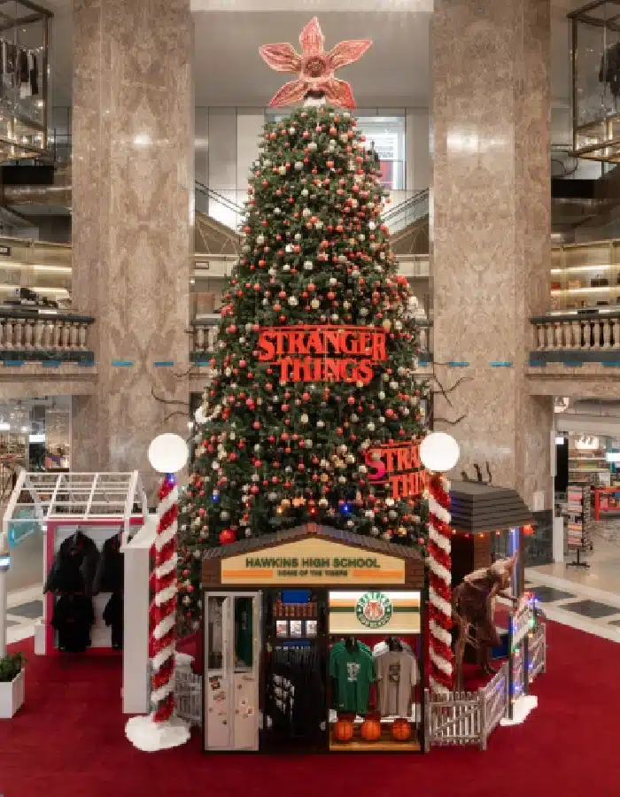 À l’occasion de l’ultime saison de la série culte, les Galeries Lafayette transforment un espace entier en décor rétro-fantastique : installations thématiques, produits dérivés exclusifs, ambiance 80’s, espaces photo et univers scénarisé. Un mariage réussi entre pop culture et esprit des fêtes.
