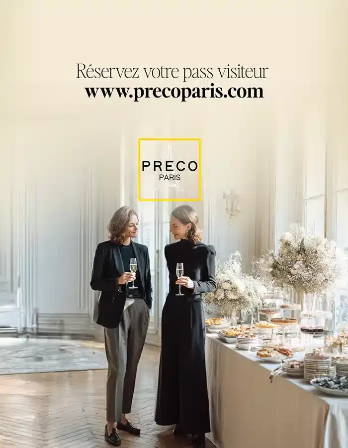 Comme détaillé dans le communiqué (page 9), l’accueil constitue l’un des marqueurs forts du salon. Dès 9h, un petit-déjeuner créatif accueille les visiteurs, suivi de déjeuners conviviaux favorisant les discussions informelles. À 17h, le rituel du salon s’accomplit autour de flûtes de champagne Ruinart et d’un goûter raffiné. Cette hospitalité délicate et chaleureuse contribue largement à la réputation de Preco 2026 comme un événement où se créent de véritables connexions.