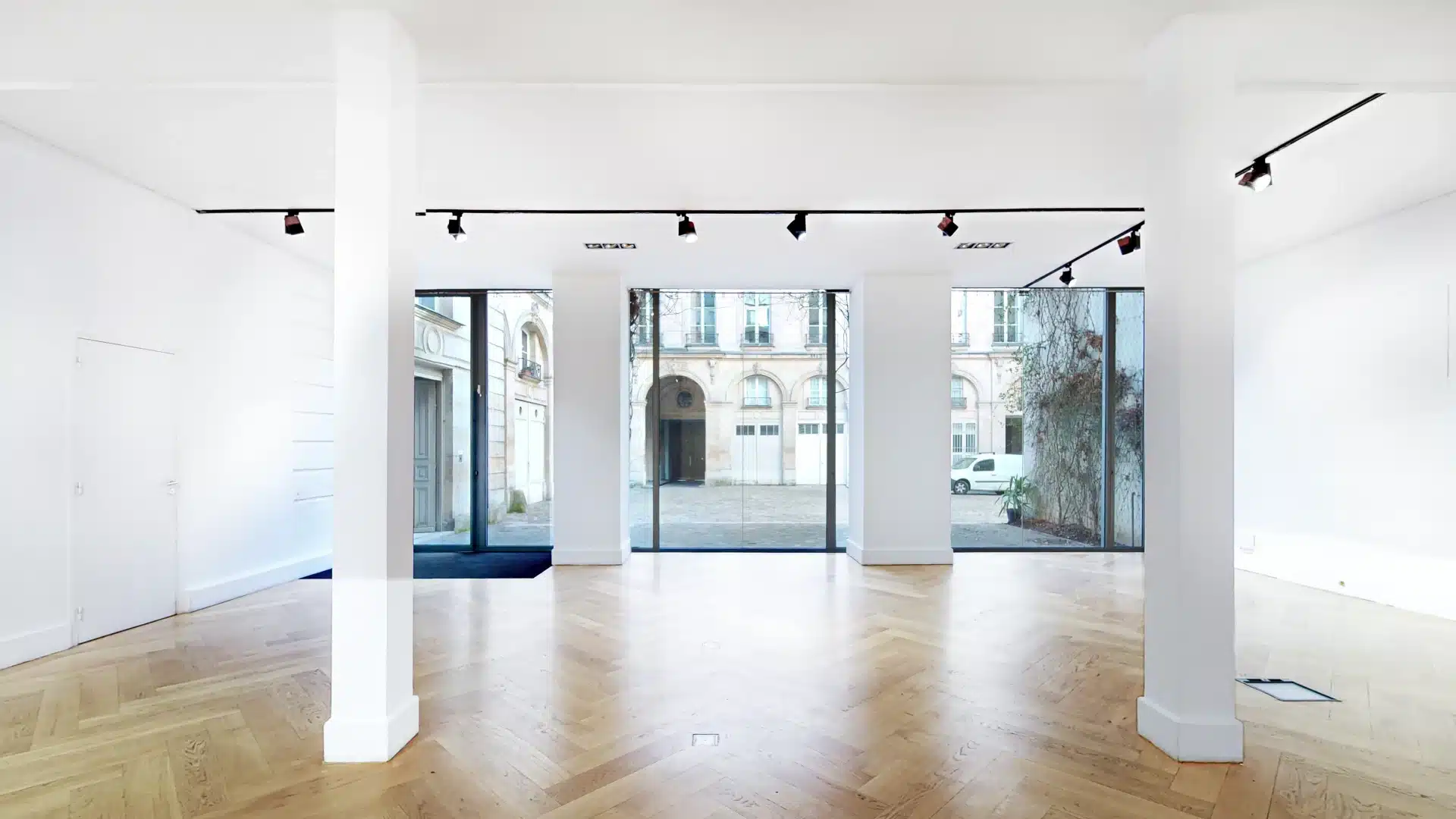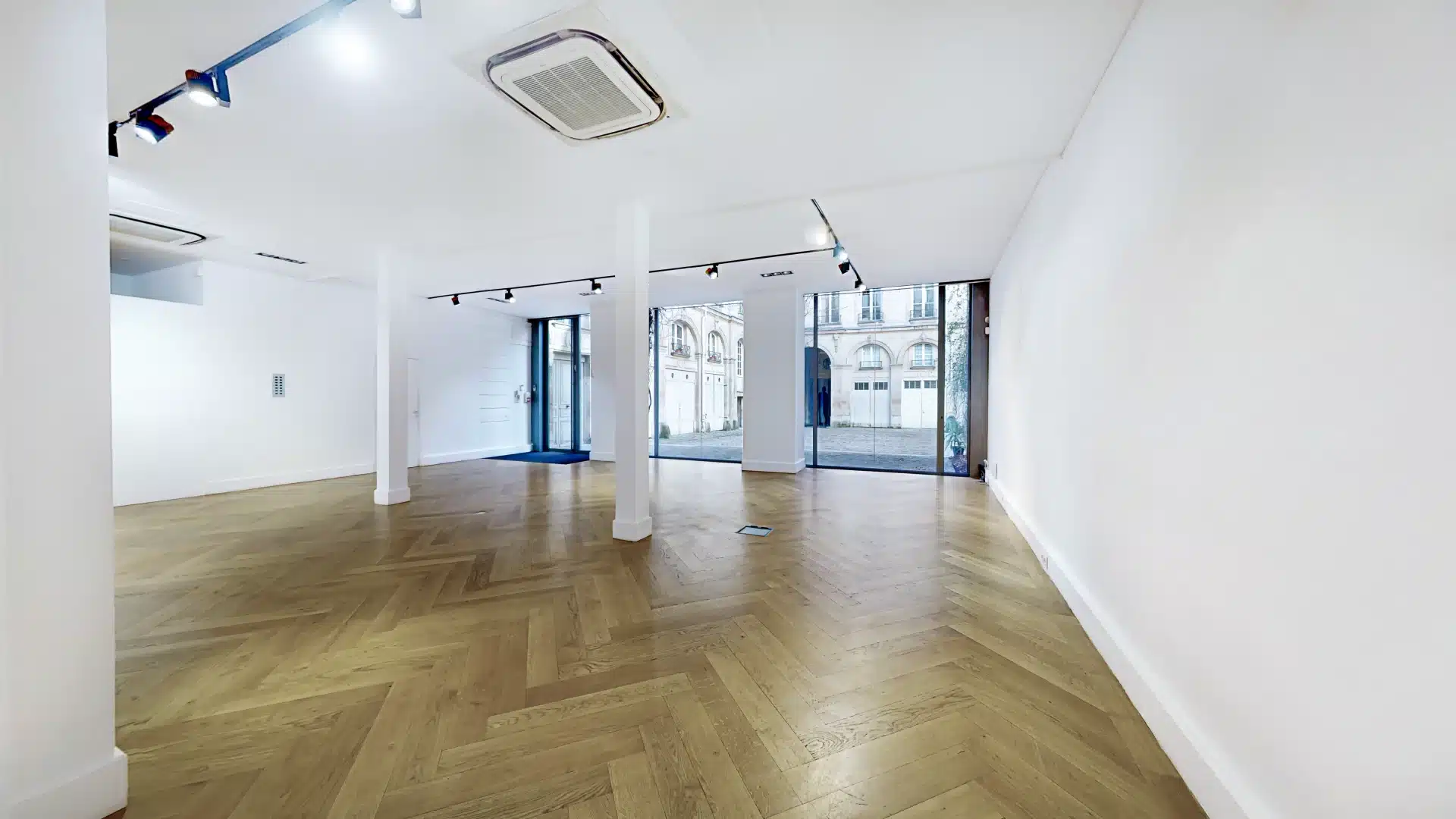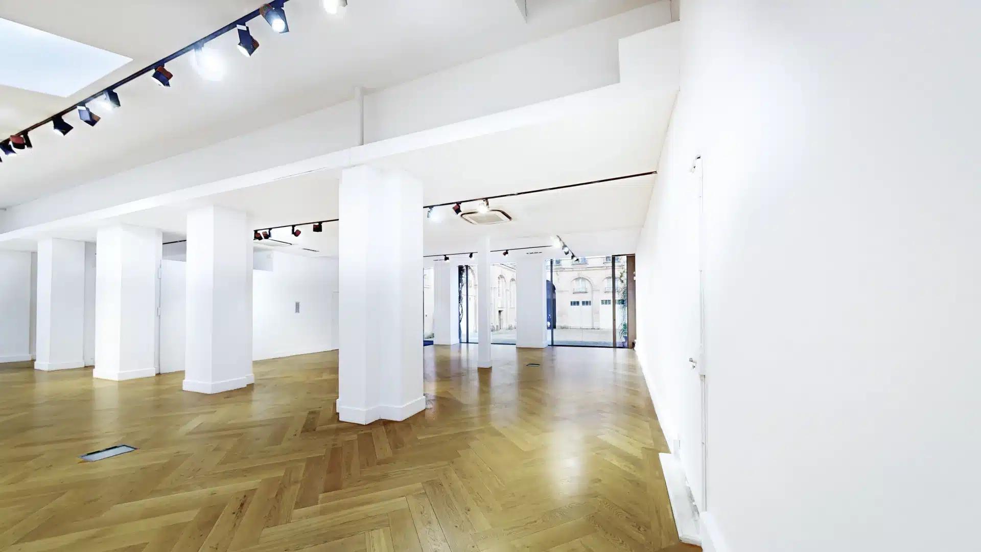 Dès l’entrée, une immense vitrine de 8 mètres de large sur 4 mètres de haut, orientée plein sud, capte l’attention et offre une visibilité optimale aux passants comme aux invités. Les murs immaculés servent de toile parfaite pour des installations artistiques ou des scénographies personnalisées. Le parquet en chêne massif, posé en chevrons, apporte une touche de sophistication intemporelle, tandis que la climatisation intégrée assure un confort optimal en toute saison.