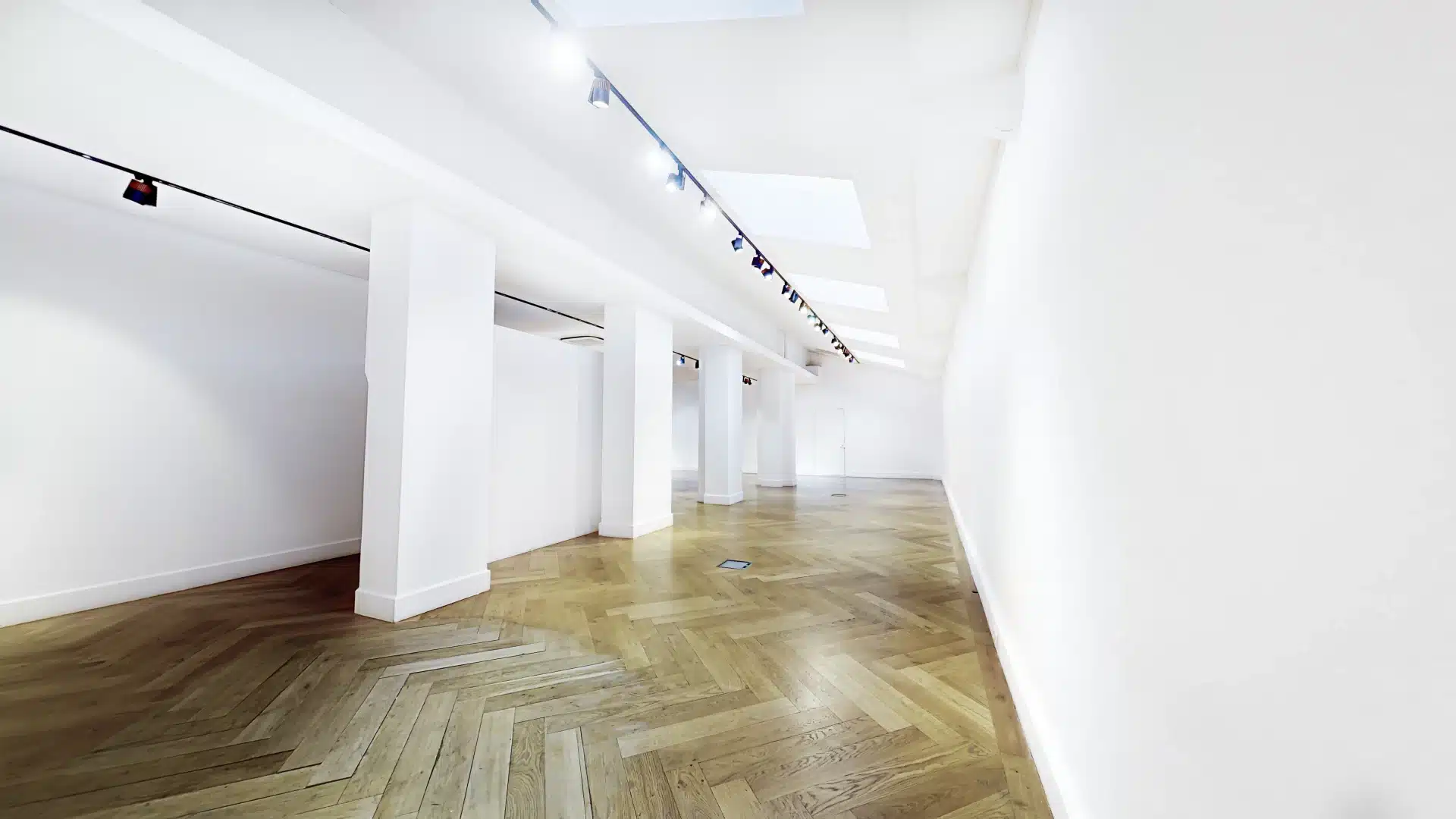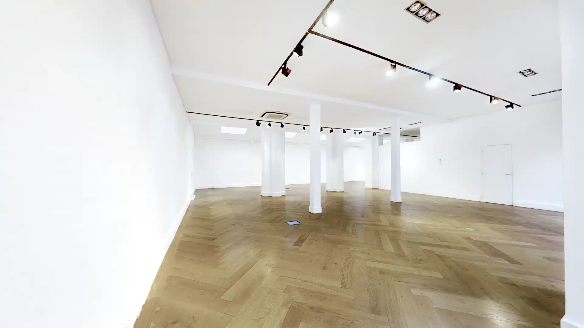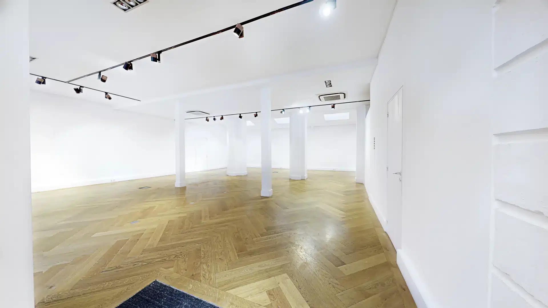 Dès l’entrée, une immense vitrine de 8 mètres de large sur 4 mètres de haut, orientée plein sud, capte l’attention et offre une visibilité optimale aux passants comme aux invités. Les murs immaculés servent de toile parfaite pour des installations artistiques ou des scénographies personnalisées. Le parquet en chêne massif, posé en chevrons, apporte une touche de sophistication intemporelle, tandis que la climatisation intégrée assure un confort optimal en toute saison.